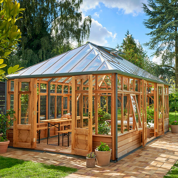It is available in two widths and comes in a variety of lengths. The Grand Grow & Store measures at 13ft wide and 12ft in length making it big enough for any garden. It is fully glazed and constructed using western red cedar.