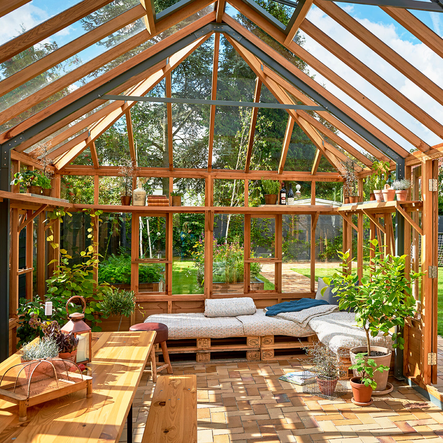 The glasshouse stands tall allowing the growing of large specimen plants, but it is also stylish enough to make an ideal space for sitting and enjoying the garden.